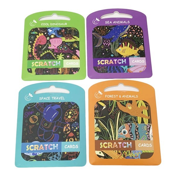 Las Scratch Cards son una propuesta creativa y mágica para que los niños den rienda suelta a su imaginación. Solo necesitan raspar la superficie negra con el palito incluido… ¡y los colores ocultos aparecen como por arte de magia!